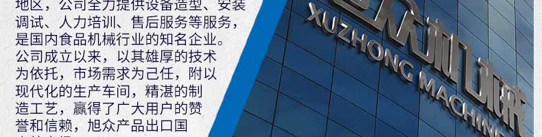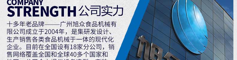 廣州旭眾食品機械有限公司是一家集科研開發(fā),生產(chǎn)設(shè)計,營銷服務(wù)為一體的現(xiàn)代化生產(chǎn)企業(yè)。現(xiàn)代化生產(chǎn)車間,精湛制造技術(shù),所產(chǎn)機械歷經(jīng)市場重重考驗,不斷贏得海內(nèi)外客戶的贊譽。